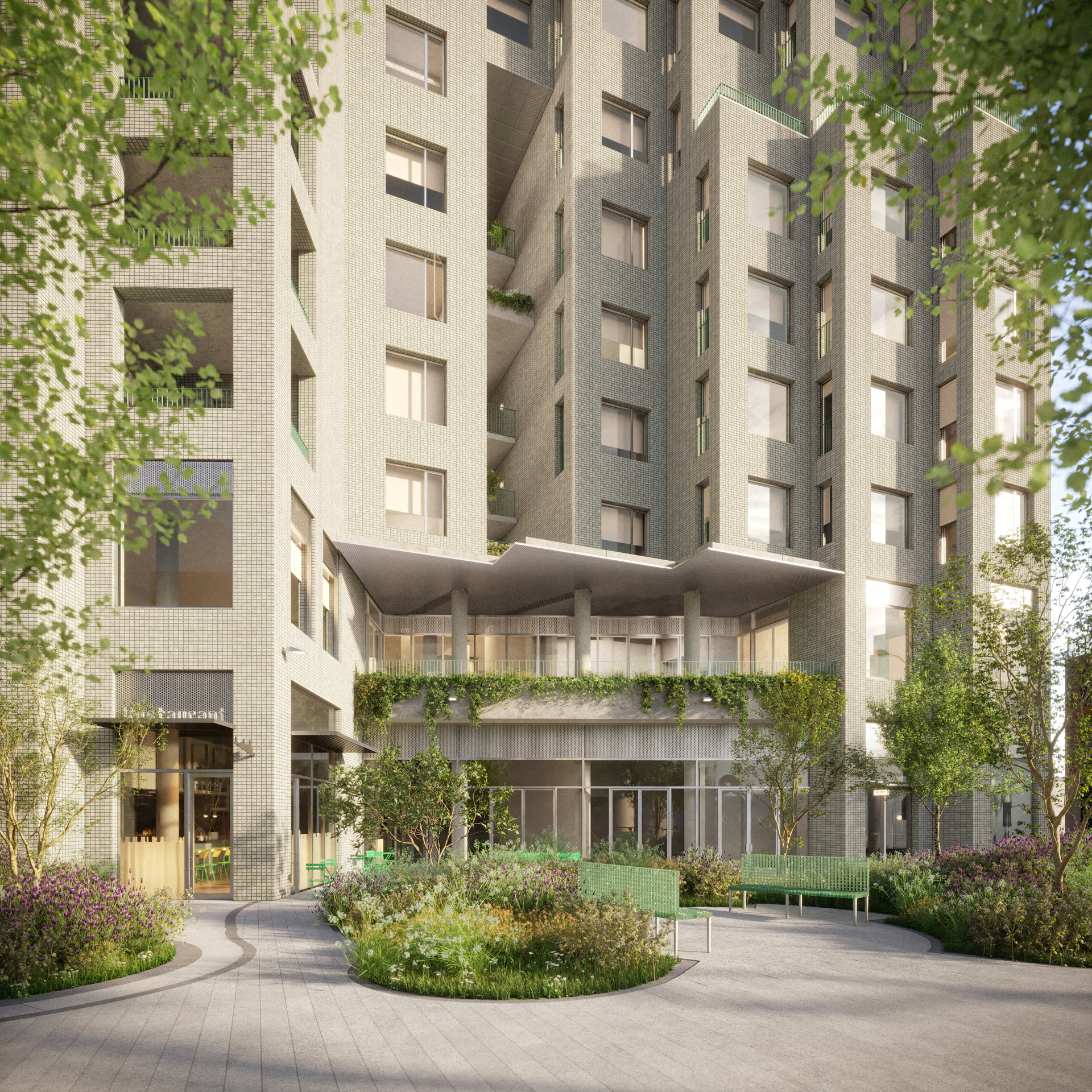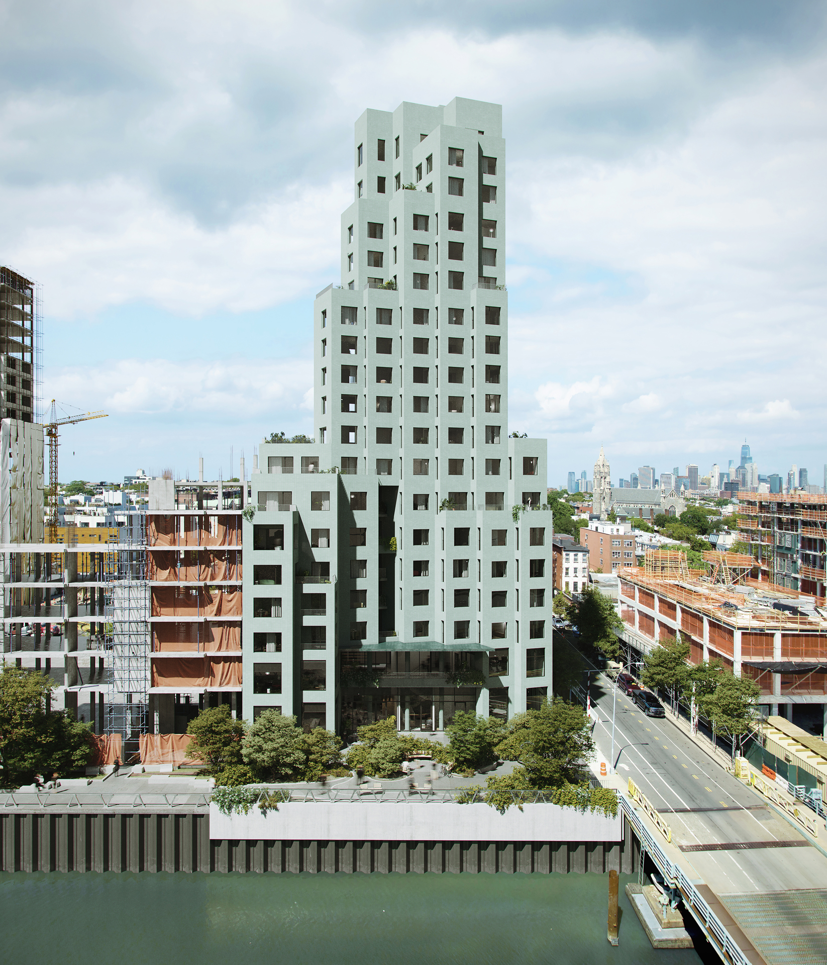 Rising as a new urban landmark, the building is defined by a sculpted form that opens to light, air, and views, while anchoring a renewed public edge for the canal. Sited in a rapidly transforming neighborhood and the airspace around the canal begins to densify, the long views that once defined the area are at risk of being lost. The building responds by aligning its units with the canal, preserving sightlines and extending the experience of the waterway deep into the living spaces. Stacked volumes of brick and glass are cut through with a dramatic void that opens terraces and courts to the city. Rotated floor plates grant each apartment long views toward downtown Brooklyn and Manhattan or along the waterway to the south, while secondary sightlines through exterior corners connect residents directly to waterfront activity.