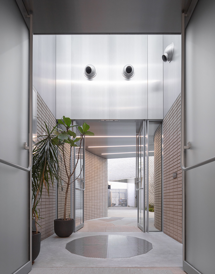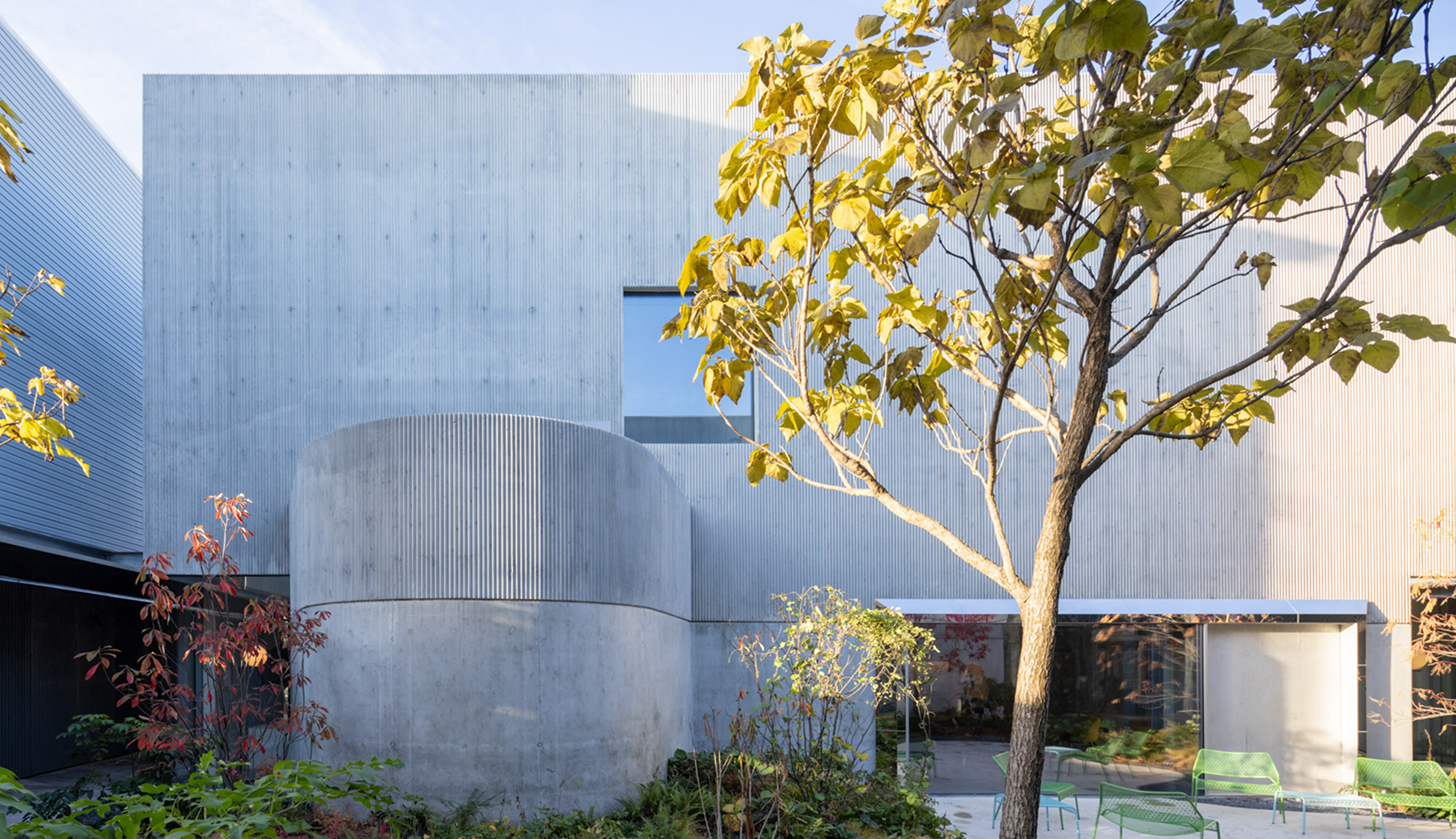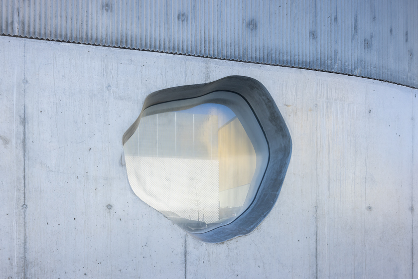 Materials render the buildings partly anonymous. Deeply textured form liners shape cast-in-plane concrete. Bricks rotate out of plane to catch a shadow. Galvanized steel bars toy with reflection and transparency. They nestle comfortably within their manufacturing and industrial storage context, and, up close, offer surprising tactilities, details, and depth that betray the familiar and the everyday.