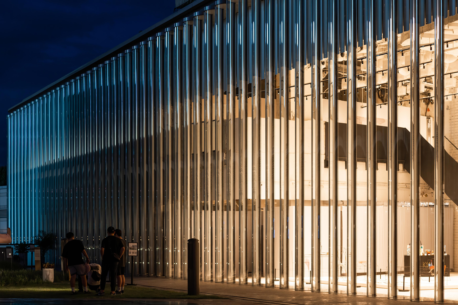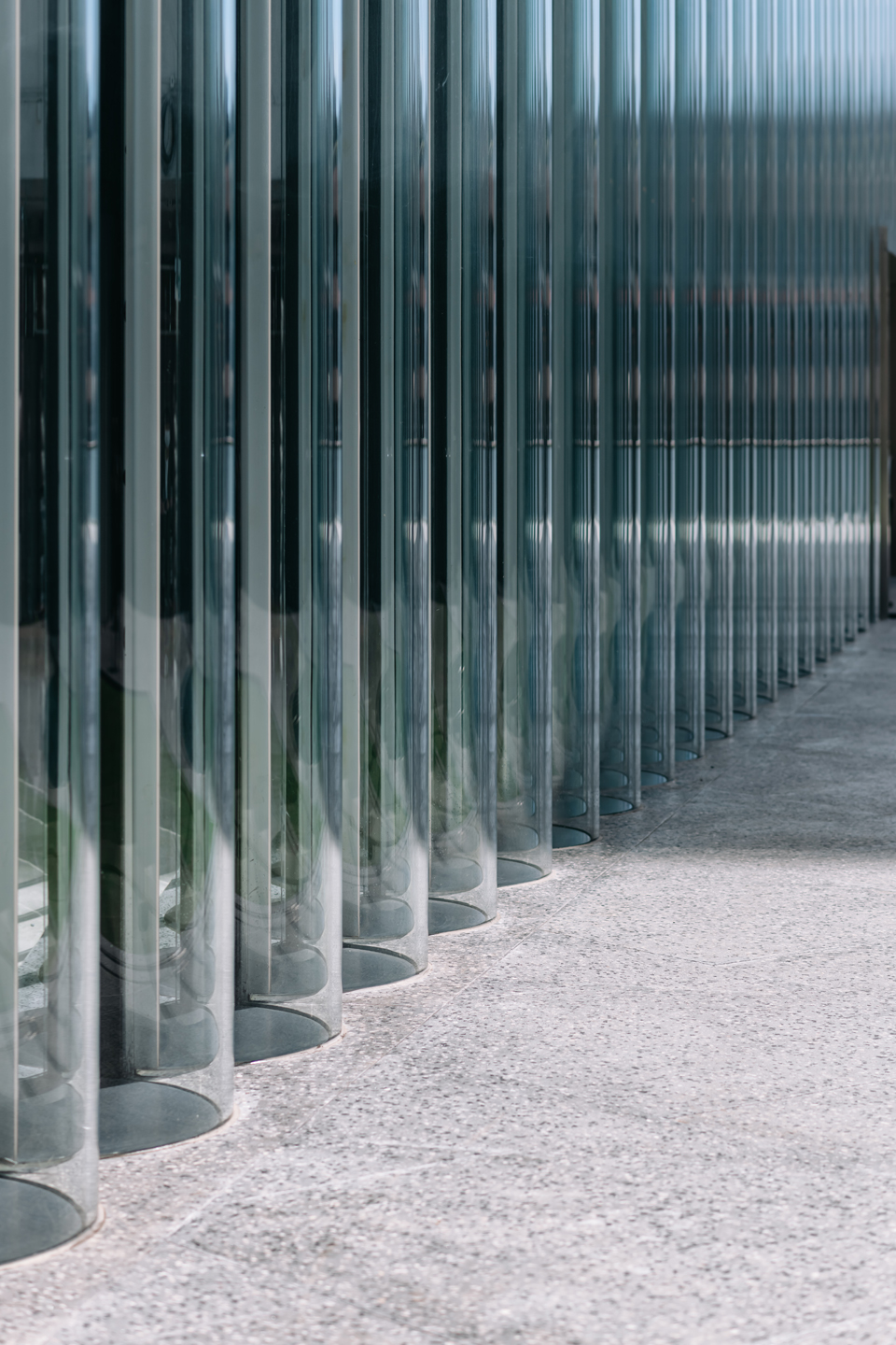 The floating museum is enveloped by a façade of 475 glass tubes, each nine meters tall and one meter in diameter, and weighing two tons. From the street, the sculptural monumentality and visual distortion of the glass create an abstraction that distinguishes the museum from its densely urban context. Up close, the glass makes its contents clear to visitors, and introduces playful arrays of reflection and light. The outsized transparency offers respite to visitors as they arrive from the bustle below.