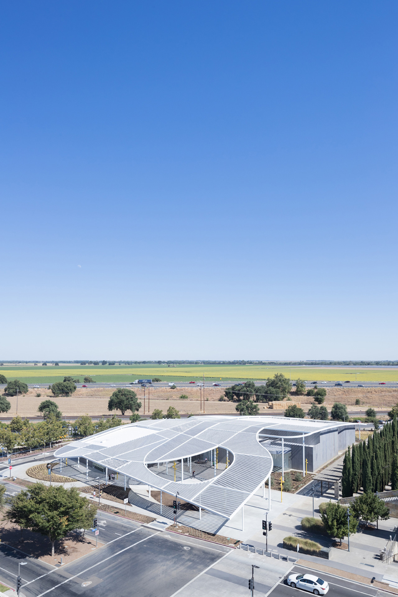 The overarching ‘Grand Canopy’ extends a rolling form patchworked with aluminum beams over both site and building. Casually taking root at the edge of the campus, the unique form of the canopy draws visitors from a distance. An environmental silhouette, the design references the site’s agricultural context and announces a new social node and emblem for the university.